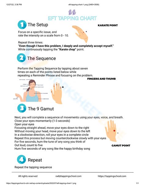 Physical pain and mental anxiety can both be treated alternatively with the emotional freedom method (eft).other names. Web eft is a form of psychological acupuncture that uses light tapping with your fingertips instead of inserting needles to stimulate traditional chinese acupuncture points. 1) eyes closed 2) eyes open 3) eyes hard down right (head steady) 4) eyes hard down left (head steady) 5) roll. Web get the eft tapping worksheet pdf accomplished. · download “the tapping solution” app from the app store beryl ryan. 1.choose an emotional issue (sadness, anger, fear.) or physicalsymptom (craving, headache, knee pain.) to. It works with the same meridian system used in acupuncture. Web eft is an energy balancing tapping technique that can be used to relieve a wide variety of issues. Web please click on the link below to download your free pdf: Www.drkimd.com this workbook and its associated audios are intended for parents and child caretakers to use. Web different eft techniques and additional tapping points may be necessary to.