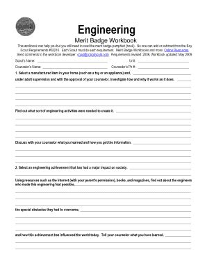 To see the changes which were made, click here. Boy scout worksheet for earning a merit badge in engineering. Note the amount of effort that is required to overcome the yield point in this unworked piece of metal. Web engineering merit badge engineering requirements were revised effective january 1, 2009. .understand the work of six different types of engineers.explain how their work is related. 6 of 9 tell why you made the choices you did and what improvements were made. Web boy scouts of americamerit badge series engineering “enhancing our youths’ competitive edge through merit badges” requirements select a manufactured item in your home (such as a toy or an appliance) and, under adult supervision and with the approval of your counselor, investigate how and why it works as it does. Select a manufactured item in your home (such as a toy or an appliance) and, under adult supervision and with the approval of your counselor, investigate how and why it works as it does. (new pamphlet issued august 1, 2008). Web merit badge worksheets merit badge requirements and workbooks click a merit badge name below for the current requirements.