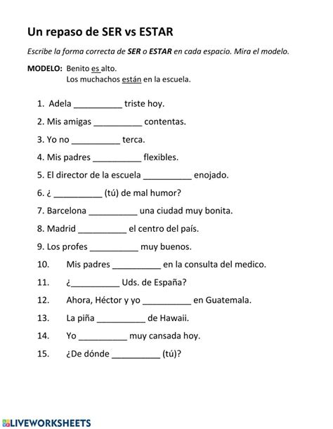 Estar means to be, but is used to describe temporary feelings or situations. Web “estar” describes conditions that tend to be temporary, and it also indicates location. [ser/estar] what is your job? Web estar interactive worksheet live worksheets > english estar conjugate estar id: Web estar think of estar as a status or condition. Web es son estoy estamos estás estáis está están part 2 1. Worksheets, handouts free 4.7 (25) word document file log in to download wish list freebie! Students will conjugate the verb, translate. This worksheet provides an opportunity to practice working with the irregular verb estar . Estar expresses how a person or thing exists, finds itself in a place or situation, how it feels, or how it remains with stability in a place,. Estar and emotions worksheet created by.