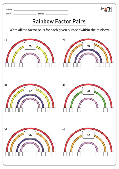 Factor Rainbow Worksheet. Complete each rainbow by writing the factor pairs for each number in the circles. It visually shows the child that each factor has a pair.