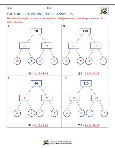 Web find the factors for each number worksheet 1 find the factors for each number worksheet 2 find the factors for each number worksheet 3 find the factors for each number worksheet 4 find the factors for each number worksheet 5 find the factors for each number worksheet 6 40 x x x x x 8 x 24 2 e. A factor tree is a tool that breaks down any number into its prime factors. 16 42 2 14 2 2 2 3) 40 4) 24 2 4 2 2 2 5 5) 18 6) 30 2 10 3 2 printable math worksheets @ www.mathworksheets4kids.com name :score : Factors are numbers that divide evenly into another number, and a prime factor is a factor that is a prime number. By using this math diagramming tool, students can identify the prime and composite factors that make up a number. 10 8 and 4 lcm: Worksheets to find the prime factor of numbers using the factor tree method. 5 45 x x x a. Download factor tree worksheet pdfs 30 63 27 10x 3 9 x 9 x 3 2 x 5 x 3 3 x 3