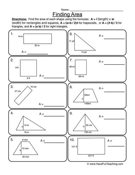 Finding Area Worksheets. Calculate the area of rectangles, squares, triangles, parallelograms, trapezoids, and circles. Calculate area with word problems and visual guides in these area worksheets!
