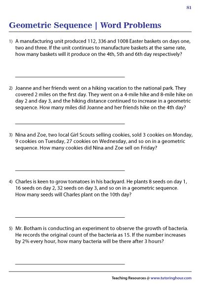 Web finite geometric series word problems. Web word problems in geometric sequence word problems in geometric sequence problem 1 : Replenish your practice stock with our free worksheets on geometric sequence word problems! This ratio is called the common ratio (r). 5 questions practice what you’ve learned, and level up on the above skills. Determine which term you want to start with: The geometric sequences worksheets on this page require students to identify and predict patterns in progressions of numbers with nonlinear relationships to each other. The company gave him a starting salary of ₹60,000 and agreed to increase his salary 5% annually. What will be his salary after 5 years? Arithmetic & geometric sequence add to my workbooks (1) download file pdf.
