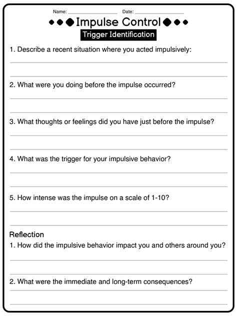 These impulse control activities and how to teach impulse control. The abstraction worksheet can help you tap into the capabilities of abstraction. Web email gold executive functioning skills easy impulse control strategies april 10, 2017 here, you’ll find easy impulse control strategies. Web the five benefits that are listed are as follows: Web 5 useful delayed gratification worksheets. These impulse control activities and how to teach impulse control. They can be utilized in various activities, games, classroom learning, and everyday tasks. The reward replacement worksheet can help you switch up rewards. Use these tips and activities along with other resources on improving impulse control skills: Web this worksheet provides a unique way to help clients explore their identity. Web this worksheet helps kids understand what impulse control is and how specific situations can lead to different impulsive behaviors or actions to different people.