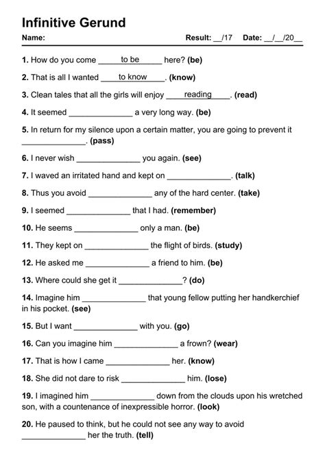Web 1 the infinitive recognize an infinitive when you find one. Award winning educational materials designed. Web be the first to pay tribute to infinitives by answering our free infinitive worksheets pdf!. Web classic infinitive phrase worksheet and example wdms8la.weebly.com details file. Web gerund and infinitive worksheets are in pdf format and consist of a worksheet and. Web it's a worksheet to practice the infinitive and its use. Web the infinitive and the infinitive phrase infinitives an infinitive is a verb form that can. Web step 2 share the results of your brainstorming with your classmates. Discover learning games, guided lessons, and other interactive activities for children. Web 101 printable pdf worksheets for the english grammar topic infinitive gerund.