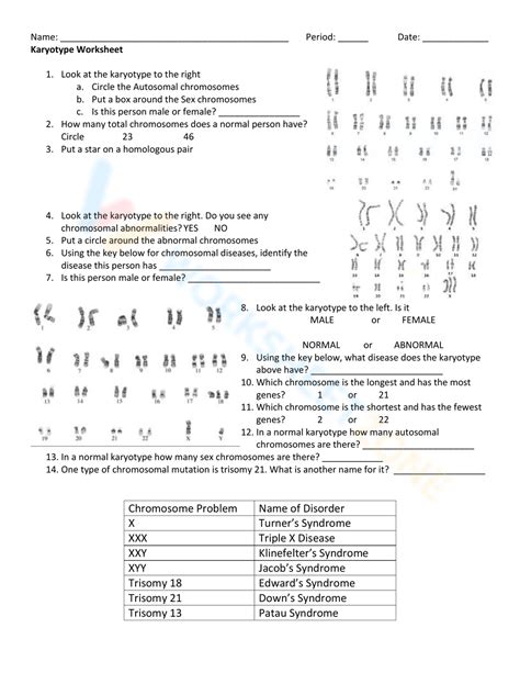 Students will describe the numbered karyotypes on a chart where they match the description of. Determine the sex of an individual from a. Web write the answers to these questions on the back of the karyotype layout worksheet. A a cell that has two copies of each chromosome b a cell that divides to form two identical daughter cells c a cell that contains two copies of each pair of homologous chromosomes Web karyotype station activities if you’ve scoured the internet looking for fun karyotype activities like i have, you know they are few and far between. Web this activity is a simulation of human karyotyping using digital images of chromosomes from actual human genetic studies. This is a great worksheet to help your students review the topics of chromosomes, karyotypes, and the various stages of mitosis and the cell cycle. Which of the following best defines a haploid cell? Web basic genetics make a karyotype a karyotype is an organized profile of a person's chromosomes. Students will be arranging chromosomes into a.