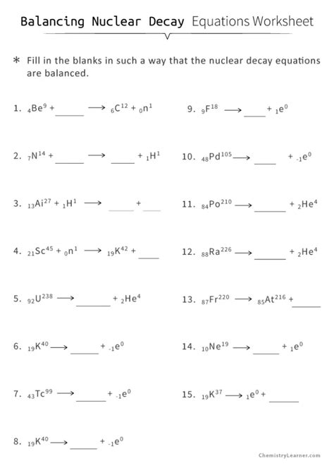Web this pack includes worksheet for the following: Web nuclear decay equations worksheet to fill in the atomic mass and atomic number of a newly created element after alpha or beta decay id: This worksheet will help students with their understanding of radioactive decay and nuclear equations. Differentiated worksheets on completing nuclear equations for alpha and beta decay. Worksheet 1 word, size 70.67 kb; Fil in the missing numbers and symbols in nuclear decay equations. Worksheet 1 pdf, size 75.83 kb; Web do you need a worksheet to help gather information about student understanding of nuclear decay and nuclear decay equations? Web to describe a nuclear reaction, we use an equation that identifies the nuclides involved in the reaction, their mass numbers and atomic numbers, and the other particles involved in. (radon has the element symbol rn.) rn.
