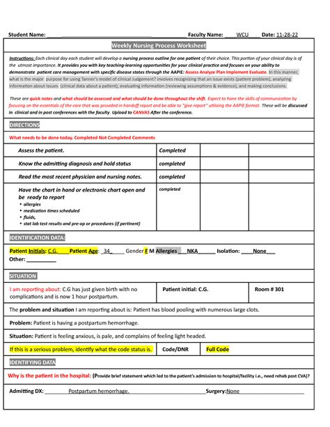 Is the official source for updates to program requirements and supersedes information on this. Nurs 316l nursing process worksheet date: Web nursing process worksheet please use this tool while in clinical as a resource to explore the nursing process. Each clinical day each student will develop a nursing process outline fo r one patient of their choice. Nurs 211l nursing process worksheet date: Nurs 101l nursing process worksheet. Implementation (specific nursing interventions that were performed during your shift): Web weekly nursing process worksheet. Application and admission to wcu in general, and application and admission to the bsn program. Is the official source for updates to program requirements and supersedes information on this. Each clinical day you will develop a nursing process outline for one patient.