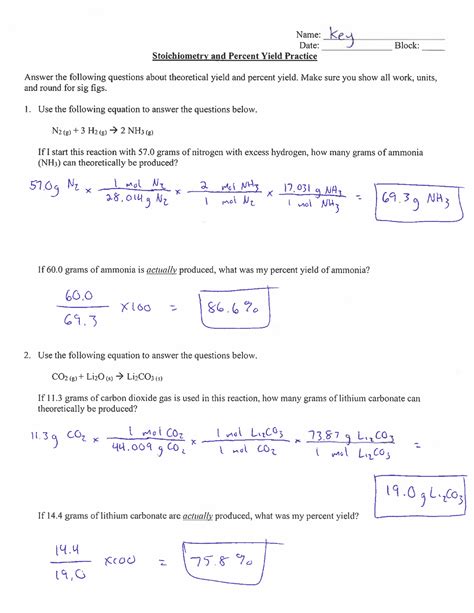 Limiting Reactant And Percent Yield Worksheet Answer Key