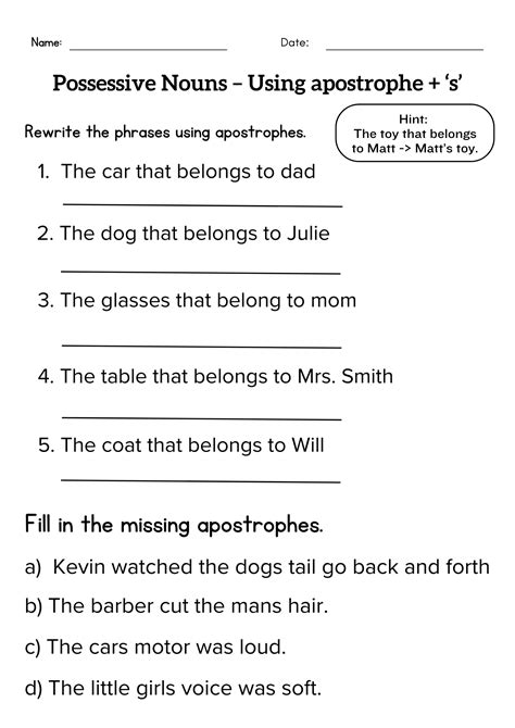 Web the possessive apostrophe change each of the sentences below so that they each contain an apostrophe to show possession. Web using apostrophe + 's for possession these grammar worksheets introduce the possessive form of nouns (the teacher's book). This apostrophe worksheet shows where to put those tricky possessive apostrophes in nouns. Students practice writing and insert the missing apostrophes in these possessive nouns worksheets. Teach your children when and where to use apostrophes and let them practice with these worksheets. Students are asked to show possession by adding an apostrophe and s after the nouns in simple sentences. His, her(s), its, my, mine, your(s), our(s), their(s) are all possessive pronouns. Web three differentiated worksheets that focus on being able to use apostrophes for possession. Proper and common nouns nouns in sentences. The tail belonging to the dog wagged. Free and printable worksheets from k5 learning;