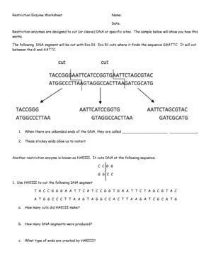 Web this worksheet covers restriction enzymes and genetic recombination. Find a suitable template on the internet. Thewords bob and madam arepalindromes. 1 unit of the enzyme activity that completely cleaves 1 microgram of substrate dna suspended in 50 micoliter of the recommended. Save or instantly send your ready documents. Explain the following terms and their role in recombinant dna technology a) restriction enzyme ___cuts dna into fragments_____ b) recognition site ___specific site or spot. Whatdopalindromes have to dowiththerestriction enzymes thatcutdna?name: Web restriction enzymes are used to cut the dna of both the organism with the desired gene and the plasmid. This allows the fusion of the nitrogen base pairs of the two dna. Name the restriction enzymes used:______________________________________________________ name the.