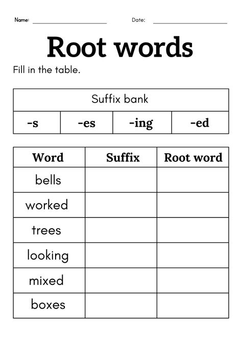 Root Word Worksheet. Students write the suffix and root/base word in separate columns. Web holidays home > english language arts worksheets > root words not all grammar and phonics lessons have to test the patience of your students.
