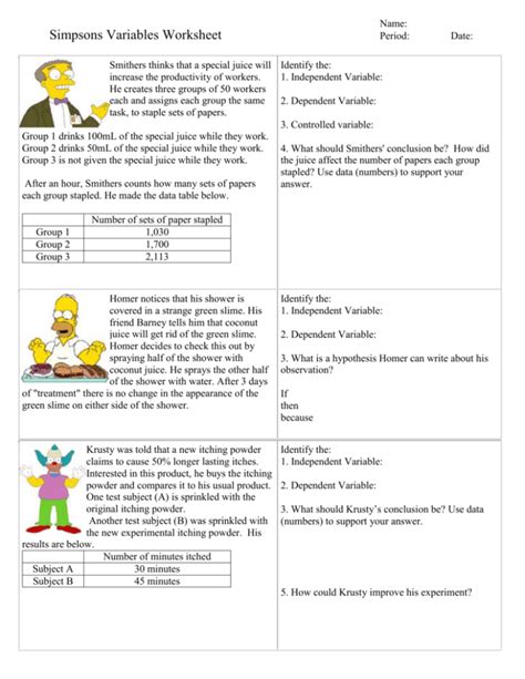 Web simpsons variables worksheet smithers thinks that a special juice will increase the productivity of workers. Web variables simpsons | teaching resources variables simpsons subject: He creates three groups of 50 workers each and assigns each group the same 2. Task, to staple sets of papers. Use this form to guide students to choose the types of variables and. Web simpsons variables worksheet smithers thinks that a special juice will increase the productivity of workers. Independent variable = special juice 3. Task, to staple sets of papers. Worksheet/activity file previews docx, 428.46. Two groups of 50 workers each and assigns each.