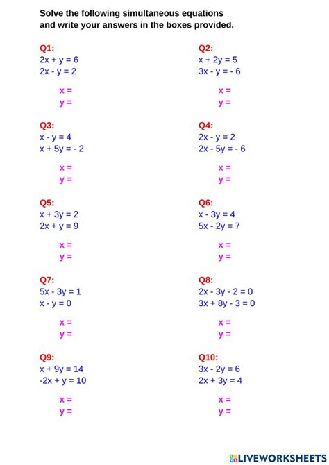 Web simultaneous equations simultaneous equations are multiple equations that share the same variables and which are all true at the same time. There are different types of simultaneous equations that we can solve. Web simultaneous equations worksheet | teaching resources simultaneous equations worksheet subject: This worksheet will show you how to work out different types of simultaneous equations questions. Worksheet/activity 18 reviews file previews docx,. Web simultaneous equations textbook exercise. Web practise solving simultaneous equations by elimination. Web simultaneous equations word problems in a farm, there are x chickens and y pigs. Students can get various methods to solve the system of linear equations from this page. The objective of these ks4 maths algebra worksheets is to be able to solve simultaneous equations. When an equation has 2.