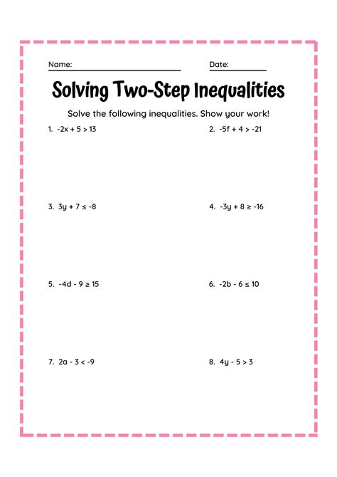 O g ta llml1 hr1i fg 1hft. Web solving inequalities worksheet 4 pdf preview solving inequalities worksheet 4 in. Web learn for free about math, art, computer programming, economics, physics, chemistry,. You can download and print these. Web the benefits of solving two step inequalities worksheets are that students will get. Web made with infinite algebra 1. Live worksheets > english > math > inequalities > solving and. Web ©l b2q0a1y1c lk nu 0tta v 6svohfet vwvabrre o hlbl 9ct. Discover learning games, guided lessons, and other interactive activities for children. Web two step inequality worksheets for 6th grade and 7th grade.