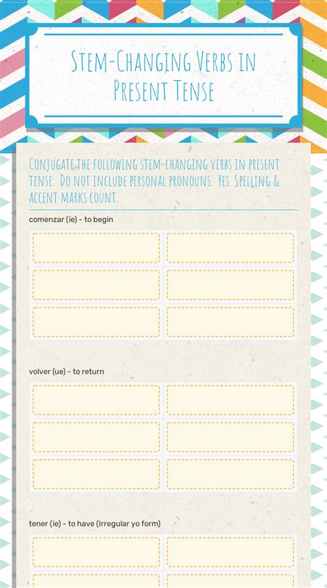 Students are to conjugate the verbs in the present tense. I like to use these worksheets as guided practice (i walk. Some of the worksheets for this concept are the spanish verb drills the big book, spanish 1 stem. This worksheet includes the conjugations of irregular spanish verbs: E:ie remember, there are three types of infinitives: Web this is a simple worksheet intended for your spanish students to practice stem changing verbs in the present tense. Español como lengua extranjera (ele) grade/level: Infinitives are made up of two parts: It features 7 short answer questions for each verb up top. This is followed by a. Web docx, 18.06 kb.