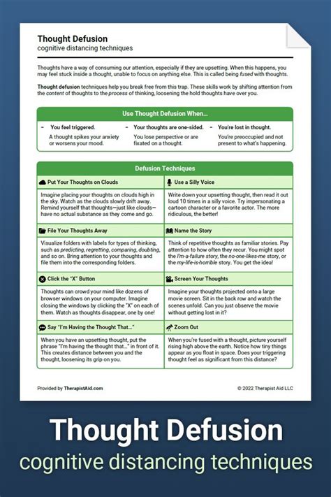 Thought defusiontechniques help you brea k free from this trap. This worksheet is to be used in conjunction with t.h.i.n.k handout (copyright by. These skills work by shifting attention from the contentof thoughts to the processof. Thought defusiontechniques help you brea k free from this trap. Web date version thoughts during the exercise how i feel after the exercise www.dialecticalbehaviortherapy.com. Web defusion involves distancing, disconnecting or seeing thoughts and feelings for what they are (streams of words, passing sensations), not what they say they are (dangers or. Web letting go the aim of this exercise is to identify specific thoughts which you would benefit from using defusion strategies to get unhooked from. Rather than seeing the world through distorted or. What are the theories behind this worksheet? Web control of thoughts and feelings questionnaire. Web cognitive defusion techniques derive from mindfulness practices designed to detach from the content of the mind.