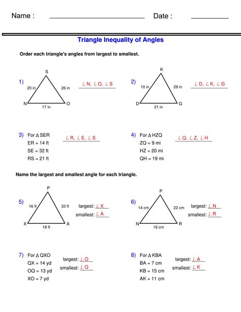 9) g f e 63° 55° 62° ge, gf, fe 10) l m n 98° 46° 36° lm, ln, mn 11) in ∆vwx m∠v = 50° m∠w = 48° m∠x = 82° vx,. These worksheets are specifically designed to help students. Web guides students through solving triangle inequalities. The triangle inequality theorem states that the sum of the lengths of any two sides of a triangle is greater than the length of the third side. This gives us the ability to predict how long a third. Web order the sides of each triangle from shortest to longest. In triangle pqr, an exterior angle at p measures 140°, and m∠ q = 60°. This triangle worksheet will produce triangle side inequality problems. 5) 44, 31 6) 32, 40 7) 39, 36 8) 45, 39 order the sides of each triangle. Web the triangle inequality theorem states that the lengths of any two sides of a triangle sum to a length greater than the third leg.