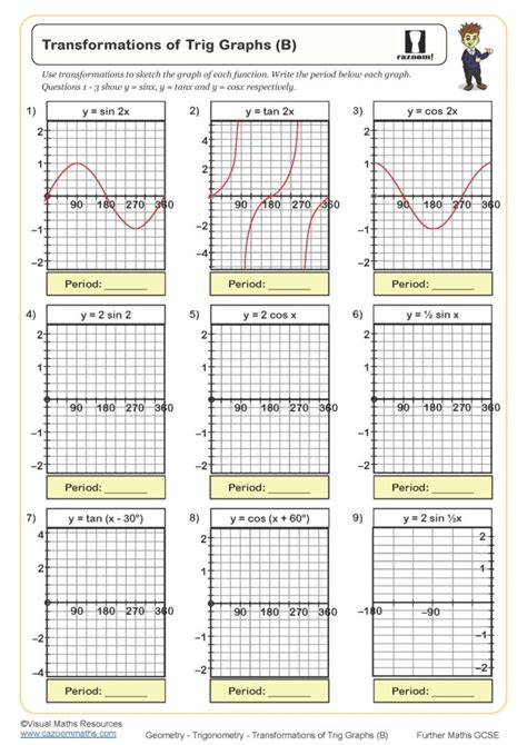 Transformations of trigonometric graphs[grade 8/9] subject: Answer these quiz and worksheet questions to find out how well you can use graphs to solve trigonometric functions. Web the reading equations from trig graphs worksheet (answers here) is an excellent resource to consolidate your learning. Worksheets are graphs of trig functions, trig graphs work, work properties of trigonometric functions, practice. How many units do we. Which of the following points are on the graph of y = cos x? Worksheet with axes drawn on for students to produce the various different transformations (translation / reflection / stretch) of the sinx. You will need to identify. Web learn trigonometry for free—right triangles, the unit circle, graphs, identities, and more. Web trig graphs revision and practice questions.