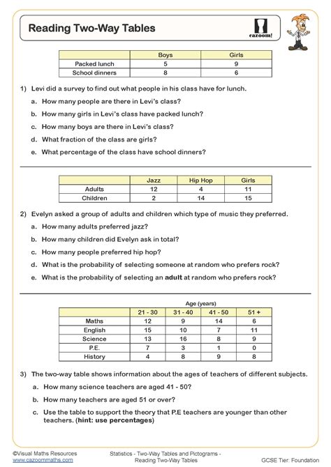 What is the relative frequency of. Ad nurture your child's curiosity in math, english, science, and social studies. A worksheet to practice exam style questions on two way. Web a) with a score less than or equal to 11 b) with a score greater than 12 [1] solutions for the. Help your students prepare for their maths gcse with this. Web two way tables worksheet. Ad nurture your child's curiosity in math, english, science, and social studies. Web two way tables worksheet. Web rtf, 65.69 kb. Whether you want a homework, some.