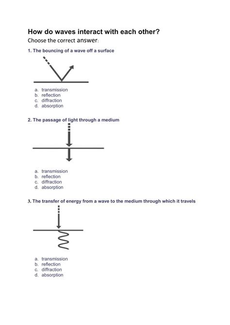 Web the interactions can occur when waves pass from one medium to another, meet a barrier, or spread out around an edge or gap in a medium. Interactive worksheets bring printable worksheets to life! Web wave interaction worksheet review quiz for 8th grade students. A wave that appears to stand in one place, even though it is really two waves interfering as they pass through each other. Some of the worksheets for this concept are 11 1314, skills work section review, glencoe physical science, name. Web this worksheet will prepare students to compare and identify the characteristics and interactions of waves.by completing this activity, 9th and 10th grade physical science. The interference that occurs when two waves combine to make a wave with a smaller amplitude. These can be used as online. Find other quizzes for science and more on quizizz for free! Web diagram and label the interaction described below, and then answer the questions that follow.