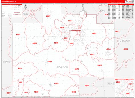 Saginaw County, MI Zip Code Wall Map Red Line Style by MarketMAPS MapSales